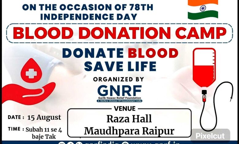 गरीब नवाज रिलीफ फाउंडेशन (GNRF) ने 78वें स्वतंत्रता दिवस के शुभ अवसर पर एक विशेष रक्तदान शिविर का आयोजन किया है। इस शिविर का मुख्य उद्देश्य “रक्तदान करें, जीवन बचाएं” है।