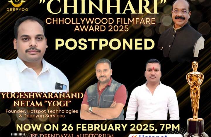 रायपुर।। हमारी संस्था हॉटस्पॉट टेक्नोलॉजी और दीप योग संस्था द्वारा आयोजित की जा रही चिन्हारी फिल्म फेयर 2025 का आयोजन 28 जनवरी को होना था जिसका समय परिवर्तन कर दिया गया है जो अब 28जनवरी की जगह 26 फरवरी दिन बुधवार को किया जाना है जिसका समय भी शाम 7:00 से रात 1100 बजे तक रखा गया है स्थान भी ऑडिटोरियम दीनदयाल ही रहेगा नगरी निकाय और पंचायत चुनाव की वजह से लगे आचार संहिता के कारण हम अपने इस प्रोग्राम को आगे बढ़ा रहे हैं हमारे द्वारा प्रोग्राम प्रचार के लिए लगाए गए तमाम होर्डिंग पोस्टर और बैनर को नगर निगम ने आचार संहिता के तहत हटा दिया जिसकी वजह से हमें परेशानियों का सामना करना पड़ा हमने हजारों पोस्टर लगाए थे जिसे हमें बिना सूचित किये हटाया गया वही हमारे अतिथि अपना समय चुनाव की वजह से दे नहीं पा रहे थे जिसकी वजह से भी हमने समय में परिवर्तन किया है आपसे आशा करते है कि आपका सहयोग हमारे साथ बना रहेगा वही इस चिन्हारी फिल्मफेयर अवार्ड 2025 मे अनेकों कलाकार अपनी प्रस्तुतियां भी देंगे जिसमें नाट्य मंचन सिंगिंग डांसिंग शामिल होगा