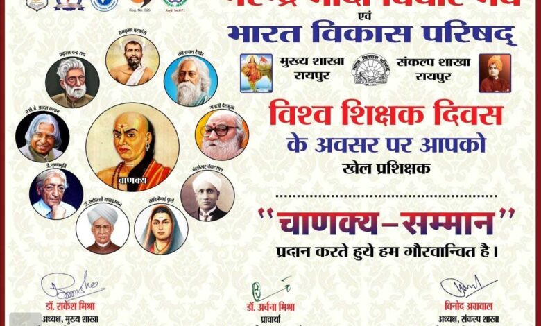 5 अक्टूबर 2025 को अंतर्राष्ट्रीय शिक्षक दिवस के उपलक्ष्य में खेल व्यायाम, योग एवं शिक्षाविदों का सम्मान किया जाना है इमें उन सभी योग्य शिक्षकों से जो कम से कम 5 वर्ष से अधिक अपना जीवन शिक्षा, अध्यापन अथवा प्रशिक्षण कार्य को समर्पित कर चुके है उन सभी का सम्मान भारत विकास परिषद और नरेंद्र मोदी विचार मंच के द्वारा किया जायेगा। इस हेतु प्राप्त आवेदन पत्र को बोर्ड मीटिंग में प्रस्तुत किया जाना है जो कि 4 अक्टूबर 2025 को शाम 4 बजे होगी। सभी चयनित शिक्षकों को 5 अक्टूबर 2025 दिन रविवार को सम्मानित किया जायेगा। ऐसे सभी शिक्षकों को अपनी योग्यता संबंधित जानकारी के लिए आवेदन करना आवश्यक है। अपना आवेदन हमारे मेल आईडी sehkarsevak@gmail.com पर कर सकते है। चयनित शिक्षकों को उनके मेल अथवा वाट्सअप में सूचित किया जायेगा।