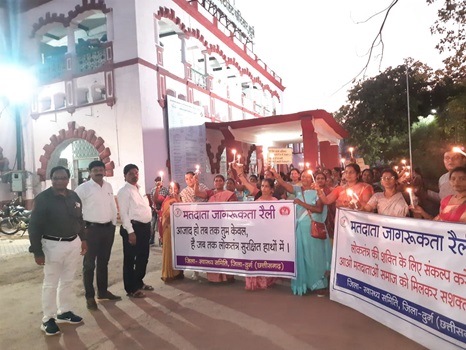 दुर्ग । कलेक्टर एवं जिला निर्वाचन अधिकारी ऋचा प्रकाश चौधरी के निर्देशानुसार एवं मुख्य चिकित्सा एवं स्वास्थ्य अधिकारी डॉ. जे.पी. मेश्राम के मार्गदर्शन में स्वास्थ्य विभाग के अधिकारियों, कर्मचारियों एवं मितानिनों के माध्यम से लोक सभा निर्वाचन 2024 निर्वाचन क्षेत्र क्रमांक 07 दुर्ग हेतु विगत 19 अप्रैल 2024 शुक्रवार संध्या 6.30 बजे कैण्डल मार्च एवं मतदाता जागरूकता रैली का आयोजन किया गया।