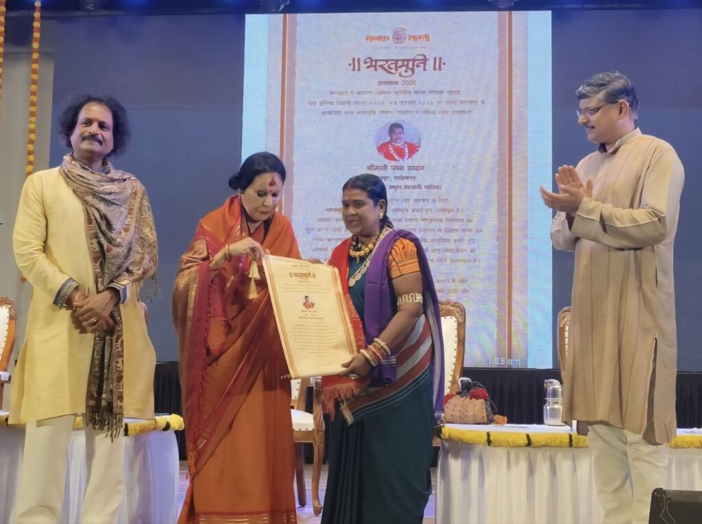 रायपुर । कला एवं साहित्य की अखिल भारतीय संस्था संस्कार भारती ने अखिल भारतीय *”भरतमुनि सम्मान 2025″* लोक कला के अंतर्गत छत्तीसगढ़ की वेदमती शैली की प्रमुख पंडवानी गायिका प्रभा यादव को सम्मानित किया गया। उनकी कला साधना और अपने कार्यक्षेत्र में विशिष्ट योगदान के लिए 01 फरवरी 2026 को ठाणे (मुम्बई महाराष्ट्र) के गडकरी रंगायतन सभा हॉल में एक भव्य समारोह में अखिल भारतीय *”भरतमुनि सम्मान 2025″* से अलंकृत किया।