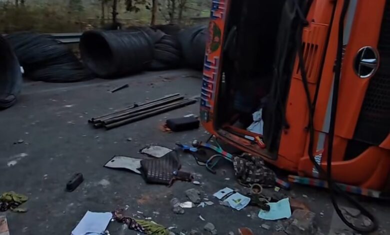 श्रीनदी पुल पर रोलिंग रॉड से लदा ट्रेलर पलटा, पुल की रेलिंग तोड़ी…
